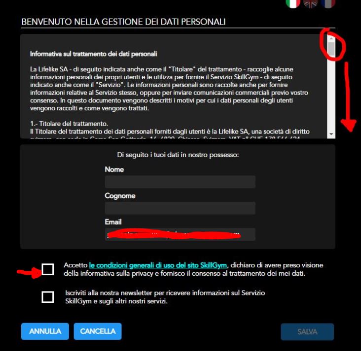 Per proseguire è necessario leggere il testo "Informativa sui dati personali" scrollandolo fino alla fine. Solo in questo modo diventerà cliccabile il box di accettazione delle Condizioni generali d'uso di SkillGym e una volta cliccato si potrà proseguire. Per maggiori dettagli guarda il printscreen allegato.